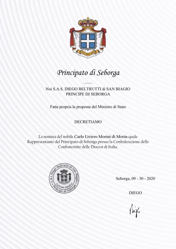 ricercatore Carlo Liviero Morini di Morin “Rappresentante del Principato di Seborga presso la Confederazione delle Confraternite delle Diocesi di Italia”.